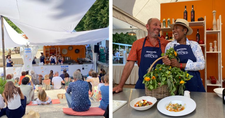 Parmi les duos et trios entre chefs, producteurs et artisans, que nous avons mis en avant sur l’espace culinaire, véritable « cœur qui bat » du salon Vivre Côté Sud, nous avons poussé à fond le bouchon du «chef dans son éco-système » : l’assiette au sens de l’art de la table, le producteur, la cuisine, le vigneron.