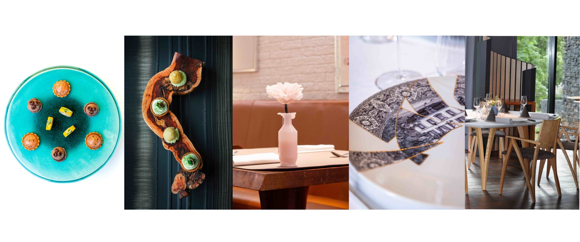 Nous avons trouvé des pépites qui iraient bien chez vous : des assiettes Kintsugi qui reprennent le dessin de votre maison, des supports à amuse-bouches en cep de vigne, des pivoines sculptées en cire, véritables petits bijoux, des céramiques de Vallauris où le chef choisit ses couleurs, et des paravents en bois et cuir pour créer l’intimité entre vos tables. Mais aussi des couteaux de dégustation uniques et contemporains, une table elliptique en cerisier, des assiettes imitant les méandres du fleuve, des tuiles dessinées de méduses pour recevoir les amuse-bouche et une console de porcelaine qui semble suspendue par des fils invisibles. Voici nos coups de cœur de l’année !
