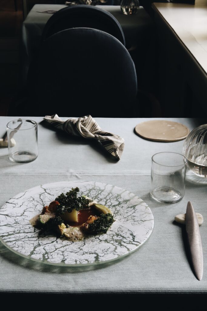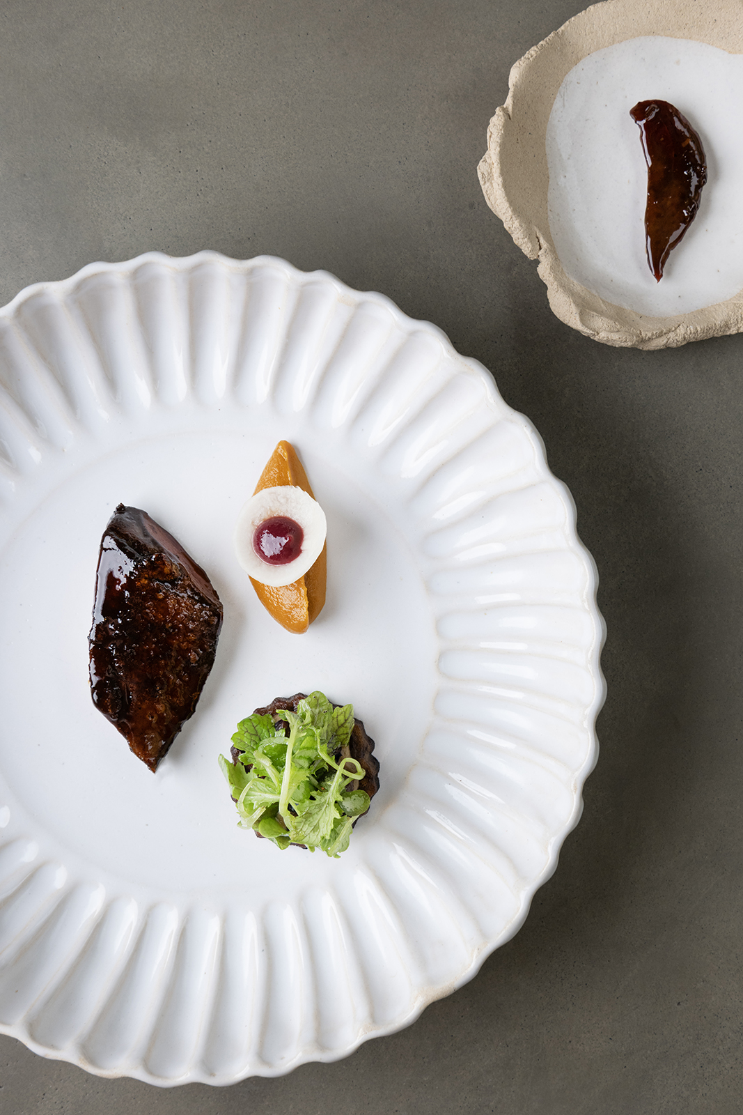 Maxime Szczepaniak (Mandibule à Alixan), nous présente la céramiste Maïlys Facchi, Atelier Calicabo, qui a notamment imaginé l’assiette du “Pigeon maturé 18 jours, aiguillette laquée, condiment aubergine rôtie“ : « Calicabo crée des pièces uniques en céramique, faites main avec une grande exigence artisanale, dans un respect total de la matière et de l’environnement. Sa vaisselle sublime nos plats et incarne parfaitement l’esprit durable, local et authentique que nous