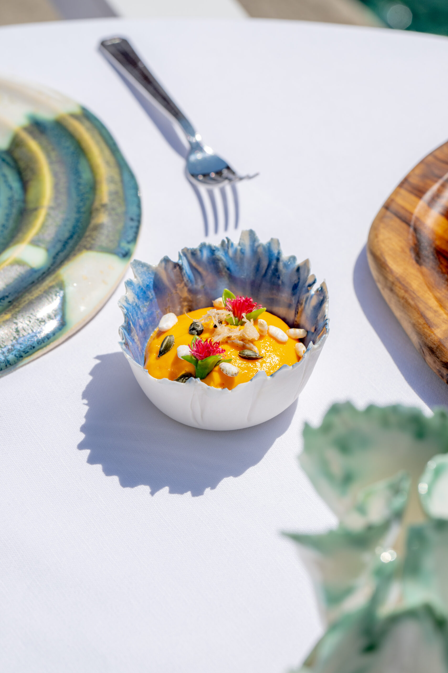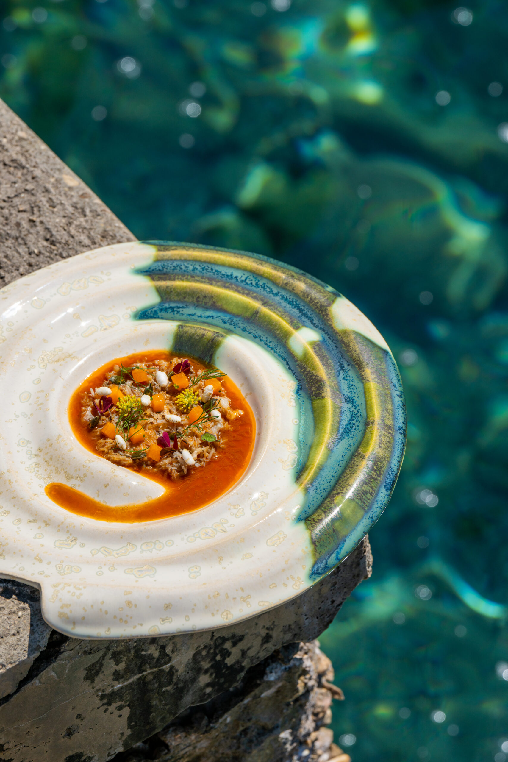 Marcel Ravin a choisi Carole Fraile pour les assiettes d’Elsa à Monaco : « J’ai découvert le travail de Carole Fraile sur les réseaux sociaux. Touché par son univers, je l’ai contactée et notre échange a tout de suite fait écho à ma vision. Carole est une céramiste talentueuse, avec une approche sensible et organique des arts de la table. Sa démarche s’accorde parfaitement avec l’esprit du restaurant Elsa, dont la thématique s’inspire du Jardin Marin. Je suis fier de collaborer avec elle pour offrir une expérience harmonieuse entre art, nature et gastronomie. » Cette passionnée de volcans parcourt le monde pour aller au plus près des éruptions. Naturellement, cette obsession pour la terre et le feu l’ont entrainée vers la céramique. Et en effet, la silice, le feldspath, les oxydes, ne sont pas sans lien étroit avec la volcanologie… Entre son sens du mouvement et les couleurs de l’eau, ses pièces collent parfaitement à la Méditerranée du Blue Bay : ici ses deux supports, en deux matières