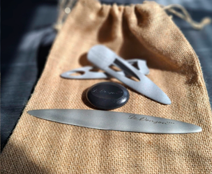 Sur la table du Domaine Saint-Clair à Étretat, les couteaux sont sur-mesure. Réalisés par le designer Matthieu Kobilinsky (MattK) pour Omar Abodib, ils semblent sortir de la Manche toute proche : ces couteaux-galets reprennent les textures et coloris caractéristiques des galets de la plage d’Étretat. Pour que la conception soit calquée sur la nature environnante, chaque objet est façonné par sédimentation, au plus proche du mode géologique de formation des falaises. Une coque