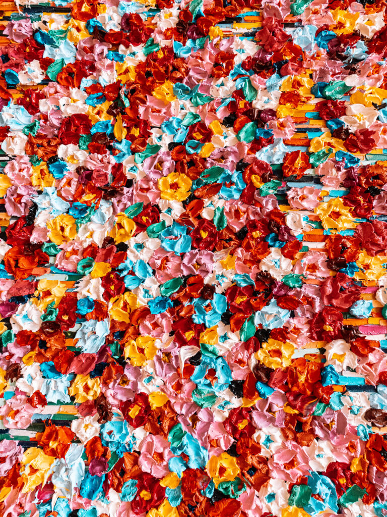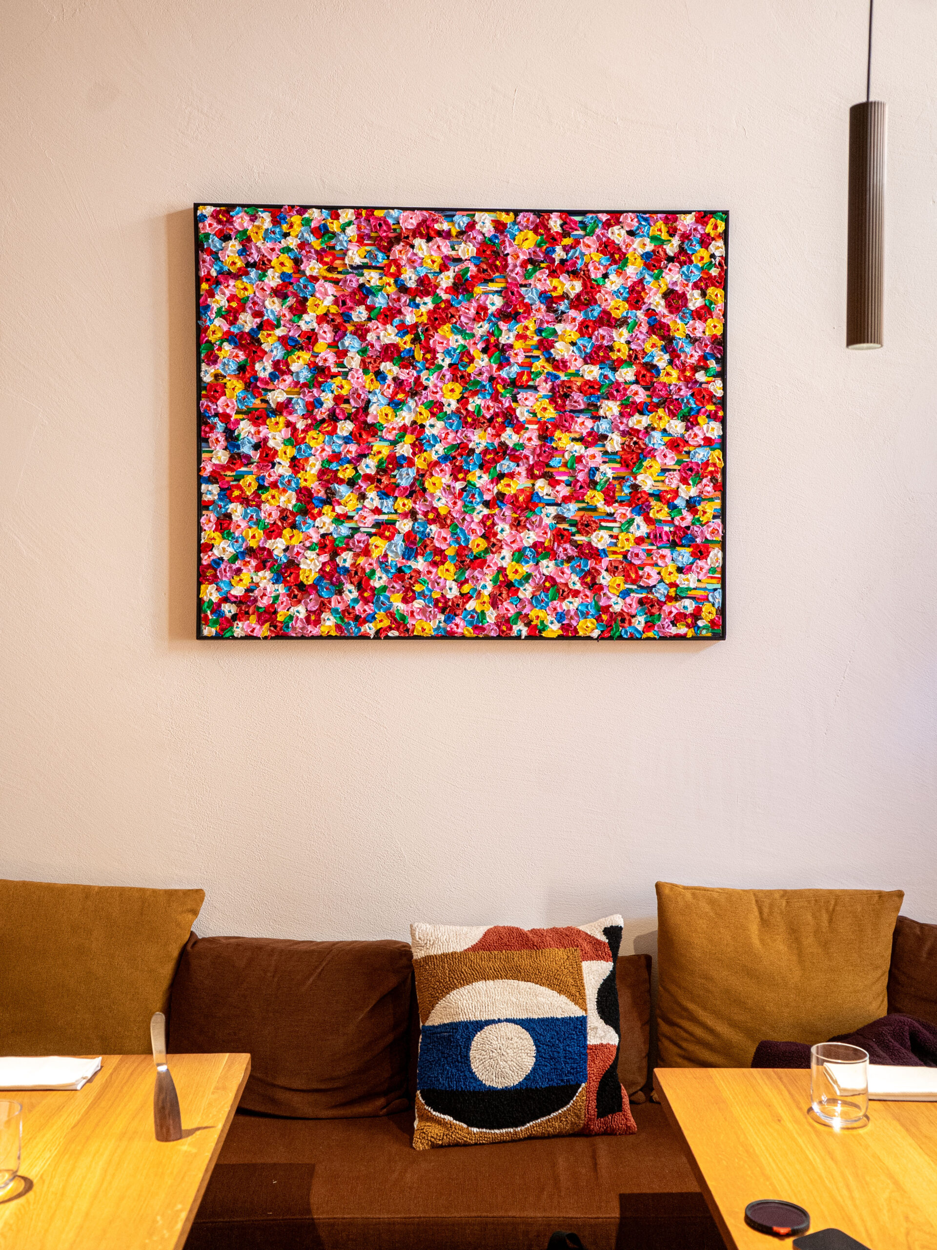 Coup de cœur de Clément Lessoud (Hortus à Toulouse) pour les tableaux de David Hortala : les toiles colorées du peintre donnent la pêche aux murs de son restaurant, au cœur du quartier des Carmes. On dirait que des pétales de roses multicolores ont été collés un à un sur la toile et l’impression de relief est bluffante : un motif floral répété à l’excès, jusqu’à l’éclatement. “C’est une éclosion continue de la matière, traversée de fraîcheur et de joie.“ Clément nous dit ce qui le touche chez ce peintre toulousain : « J’ai tout de suite été attiré par l’univers de David, qui, à travers ses toiles, explose un lieu d’une chromatique envoutante. La série « Le Bouquet“ est en osmose avec l’état d’esprit du restaurant, saturant de matières et de gaieté tout un espace. »