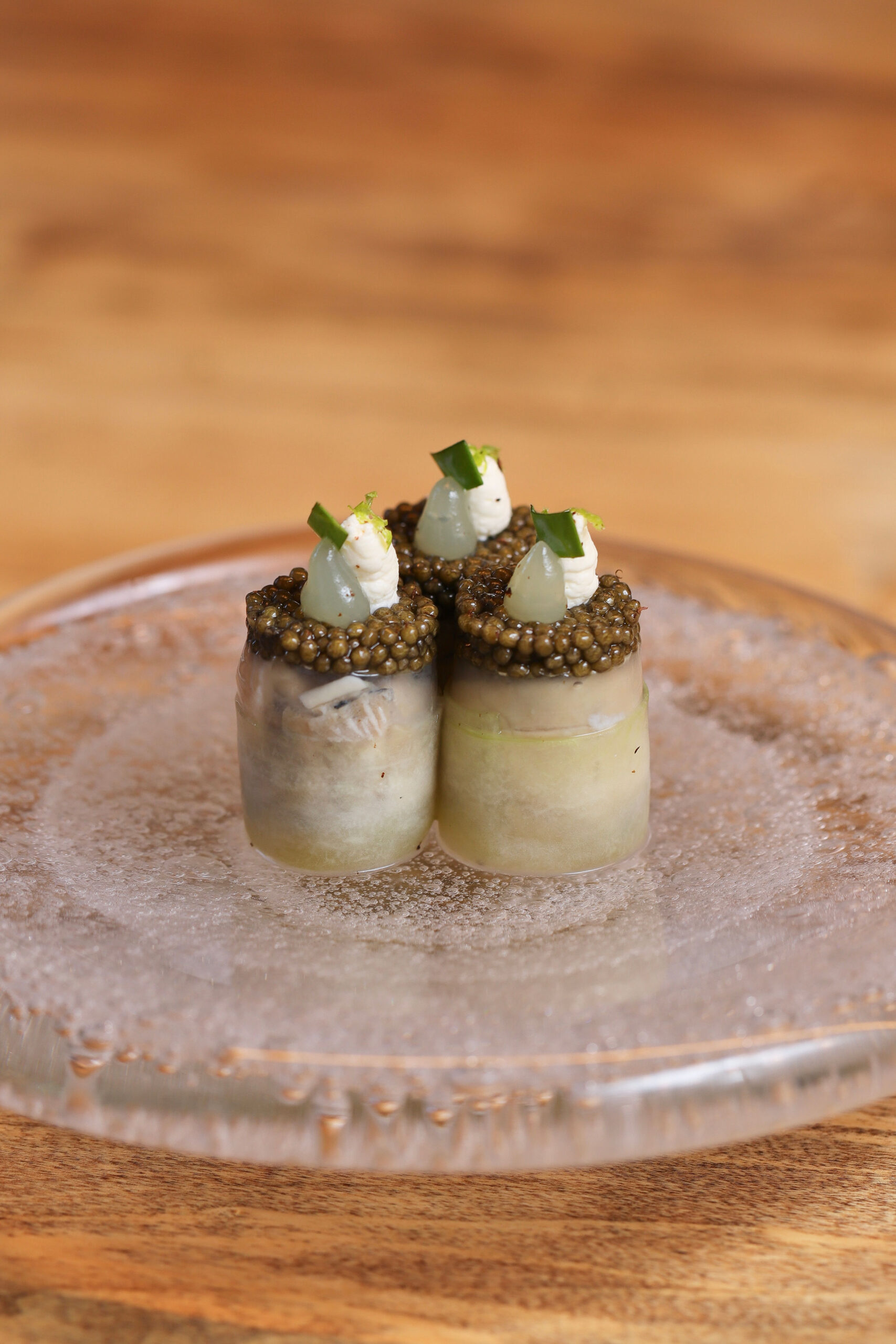 « Au moment de servir, on démoule le cylindre et on l’entoure d’une longue lamelle de concombre crû, coupé à la minute pour préserver toute son eau. Garnir le dessus du cylindre avec un mélange de citron-caviar, feuilles de mertensia ciselées et brunoise de pomme verte. Couvrir le sommet de caviar Osciètre Impérial @Petrossian. Terminer avec une noisette d’espuma de bouillon de coquillages, quelques zestes de citron vert et une pointe d’huile de menthe. Les huîtres Gillardeau rencontrent la vivacité du concombre et de la menthe : on est dans la fraîcheur. Là-dessus, l’Osciètre apporte de la profondeur et de l’élégance, transformant cette entrée en un véritable hommage à la mer. »