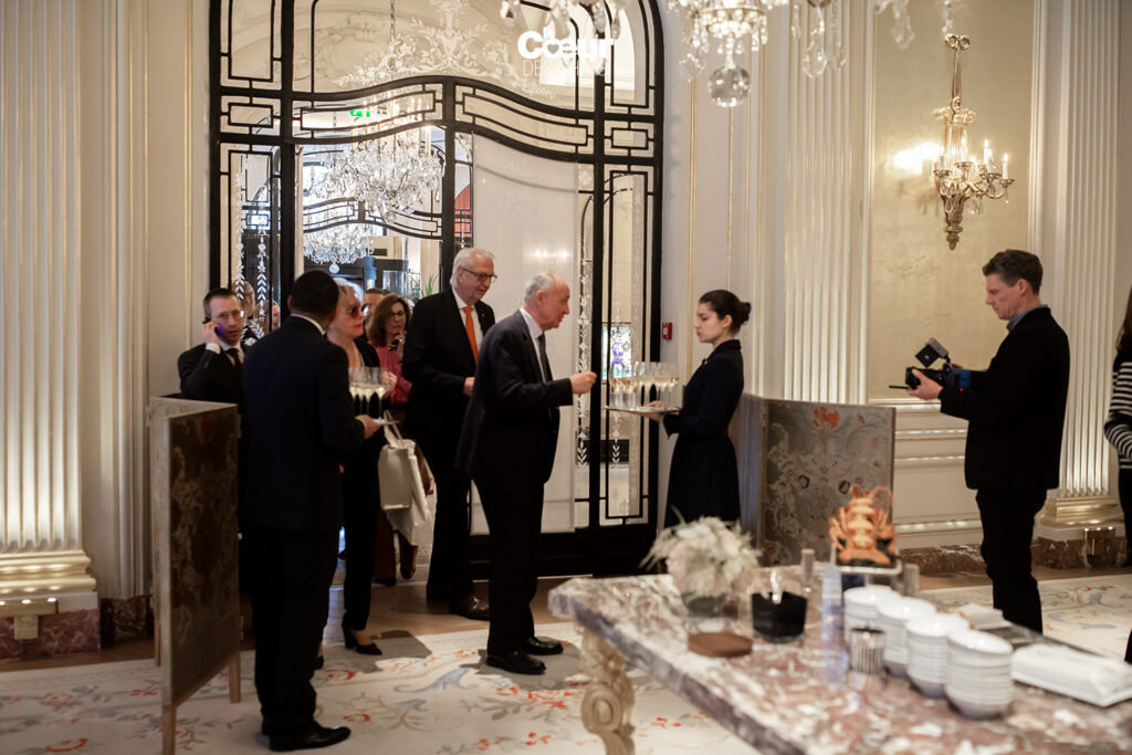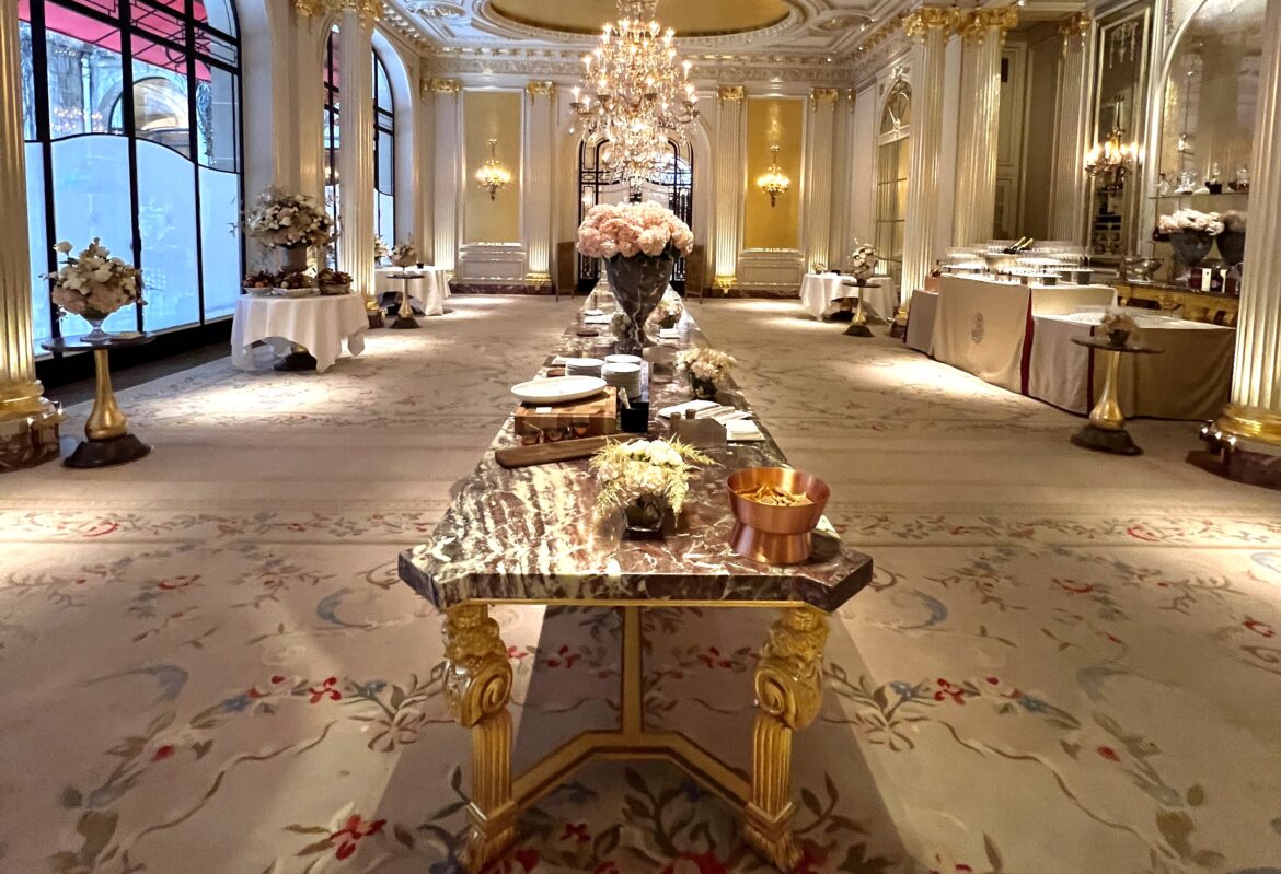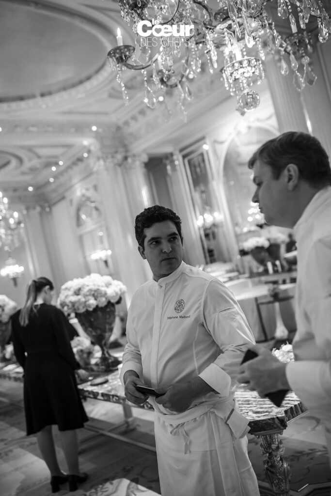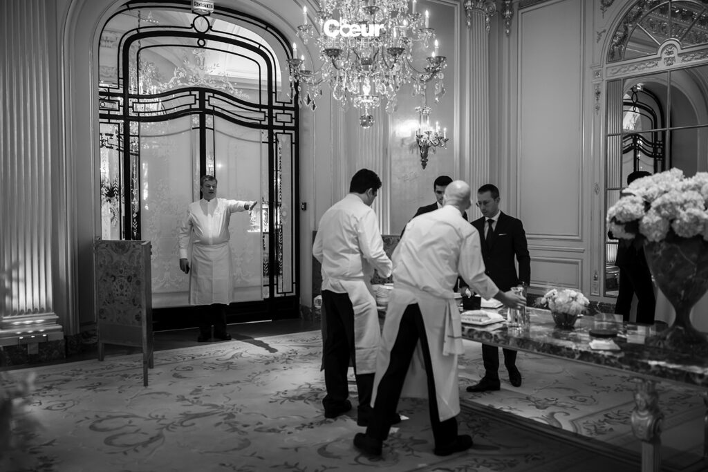 On vous emmène dans les coulisses du Plaza Athénée pour ce deuxième jour du Congrès des Grandes Tables Du Monde en février 2024. Dans le restaurant Jean Imbert, toute l’équipe se prépare à accueillir les membres après leur assemblée générale. Jocelyn Herland orchestre les envois de la cuisine : 12h45, les plats froids arrivent sur la table royale. Et juste avant l’ouverture des portes, le chaud entre en scène pour que les convives soient imprégnés des parfums dès qu’ils entrent. Et, par dessus tout, on sent l’envie des équipes d’accueillir les membres venus du monde entier…
