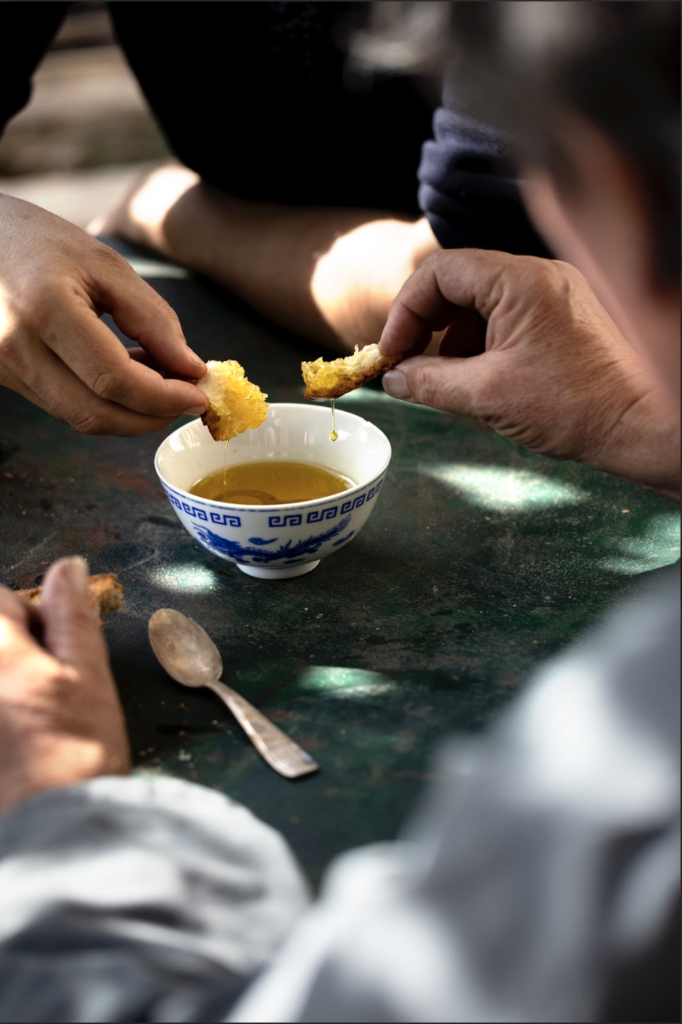 Jérémy Galvan reste fidèle à Philippe Chansigaud, producteur d’huile d’olive à la Ferme de Gratte-Semelle, à Raphèle-lès-Arles, proche de Tarascon. Le chef nous raconte cette collaboration particulière, qui a démarré il y a sept ou huit ans dans son ancien restaurant de Lyon : « Philippe a débarqué avec une valise en bois remplie de mignonettes. Il effectuait une tournée pour faire découvrir ses produits aux chefs du coin. J’ai eu un coup de cœur tant pour lui que pour ses huiles d’olive. Il est brut de décoffrage et jusqu’au-boutiste dans ses combats : sa quête du beau et du bon est radicale dans une région particulièrement soumise à la pression foncière, et il a un engagement fort au sein d’associations de défense de l’environnement et des terres agricoles. Sur ses onze hectares arides et caillouteux, son approche de l’olivier est basée sur la lenteur et l’observation. Il va au-delà du bio : le lien avec la nature est pour lui une conviction profonde et non un label. Au départ, j’avais du mal à utiliser son huile car j’étais intimidé : elle est puissante et j’avais peur de dénaturer sa pureté ! J’ai fini par me l’approprier, sans jamais la cuire, avec une utilisation plutôt condimentaire. Il produit aussi du miel et un peu de lait de chèvre. Caprins et poules se promènent parmi cinq mille oliviers des variétés aglandau, bouteillan, verdale et picholine. Philippe se considère lui-même comme un « accompagnateur de nature ». C’est l’un des très rares produits pour lesquels je déroge à ma démarche locavore. »