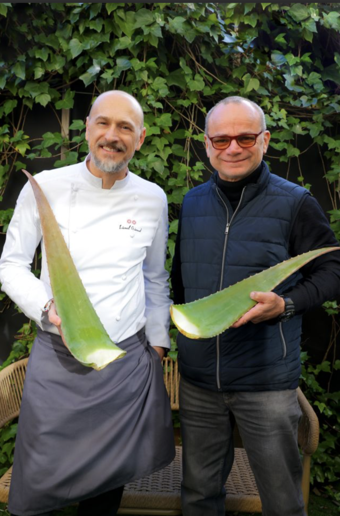 Lionel Giraud nous présente un vigneron qui a su rebondir, et cela force le respect : « Laurent Maynadier (Domaine Le Champ des Sœurs), est vigneron à Fitou depuis treize générations. Il a su anticiper les bouleversements climatiques qui touchent son territoire. Face aux vendanges de plus en plus précoces et à la sécheresse, il a choisi d’innover en développant notamment la culture d’aloe vera, en agroforesterie et en bio. Je privilégie les produits de mon terroir, surtout lorsqu’ils apportent un bénéfice pour la santé. Intégrer l’aloe vera dans ma cuisine s’est donc naturellement inscrit dans cette démarche. Récoltée à la main, elle apporte fraîcheur et tension végétale uniques à nos assiettes. Travailler avec Laurent, c’est accompagner un mouvement : c’est intégrer dans l’assiette une réponse concrète aux défis de demain. À notre table, l’aloe vera incarne une gastronomie tournée vers l’avenir, profondément ancrée dans son territoire et portée par des producteurs engagés. »