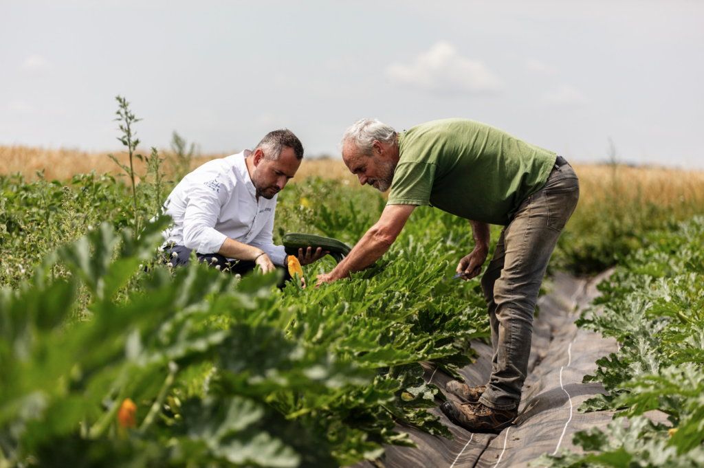 Pour David Gallienne, la cuisine ne commence pas en cuisine, mais bien dans les champs. Il nous présente Jean-Marc, son maraîcher situé à Lommoye : « À la Bioferme de Jean-Marc, tout débute par le travail de la terre, le respect du vivant et le rythme des saisons. C’est une histoire de patience, d’observation et de transmission, où chaque légume raconte le sol dont il est issu et la saison qui l’a vu naître. Ce lien direct avec la terre incarne pleinement notre vision : la cuisine commence dans la terre. Avant le geste en cuisine, il y a le travail patient des sols, la compréhension des saisons et de ce qu’elles ont à offrir. Les légumes de Jean-Marc racontent ce lien essentiel entre la terre et l’assiette, et nourrissent une réflexion profonde autour du végétal : comprendre ce que la nature peut offrir à l’instant présent, accepter ses contraintes et sublimer ses cycles. De la graine à l’assiette, cette collaboration repose sur une confiance partagée et une vision commune : proposer une cuisine sincère, engagée, profondément ancrée dans son territoire, où la saisonnalité guide la création et donne du sens à chaque plat. »