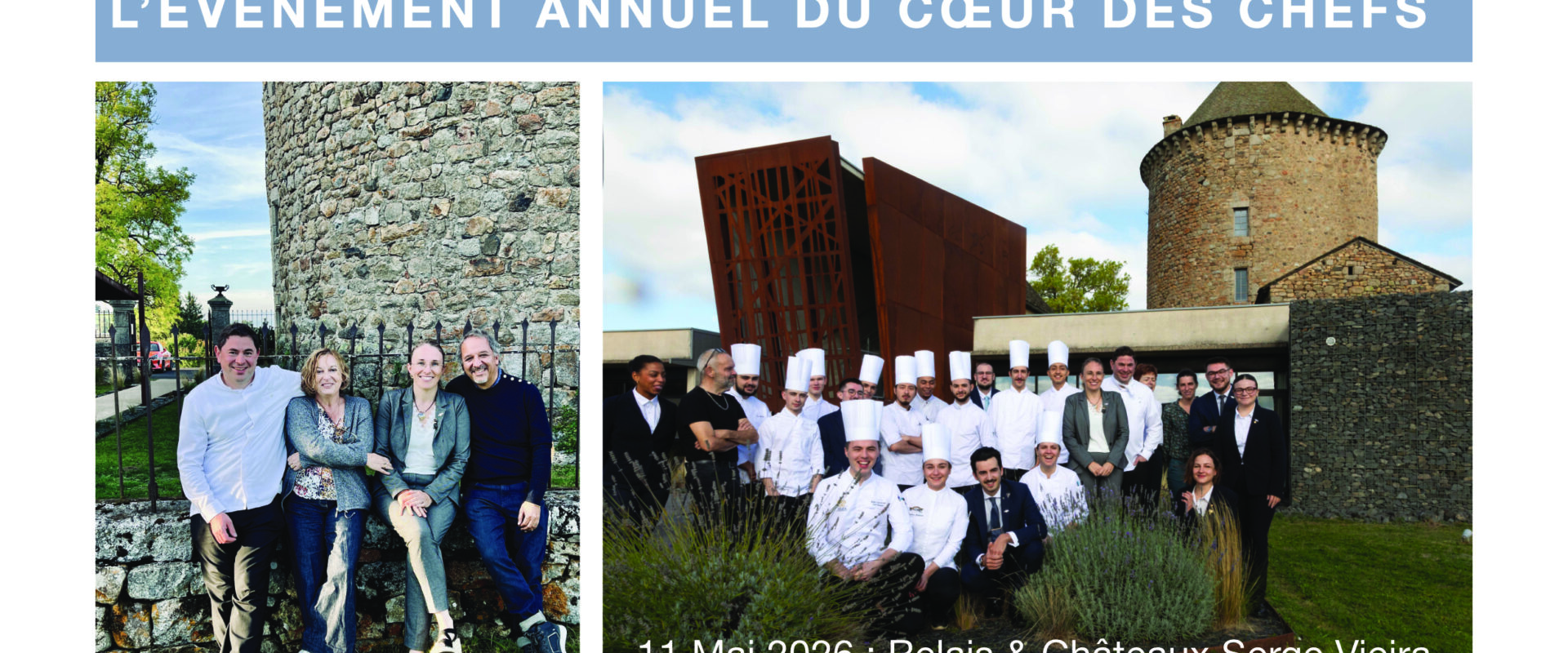 L’événement annuel du Cœur des Chefs se prépare : nous serons accueillis les 10 et 11 mai 2026 par Marie-Aude Vieira et Aurélien Gransagne, au Relais & Châteaux Serge Vieira à Chaudes-Aigues (au sud de Clermont-Ferrand). Retrouvez ici le programme, ainsi que les contacts utiles pour confirmer votre présence, vos réservations et la logistique. Au fur et mesure de notre préparation, nous mettrons à jour ci-dessous le détail de l’événement.